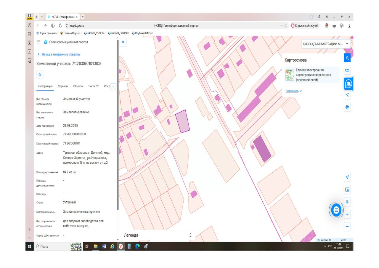 кадастровый номер 71:26:060101:808; местоположение: Тульская область, г. Донской, мкр. Северо-Задонск, ул. Некрасова, примерно в 15 м на восток от д. 2; площадь 842,0 кв.м; разрешенное использование: для ведения садоводства для собственных нужд