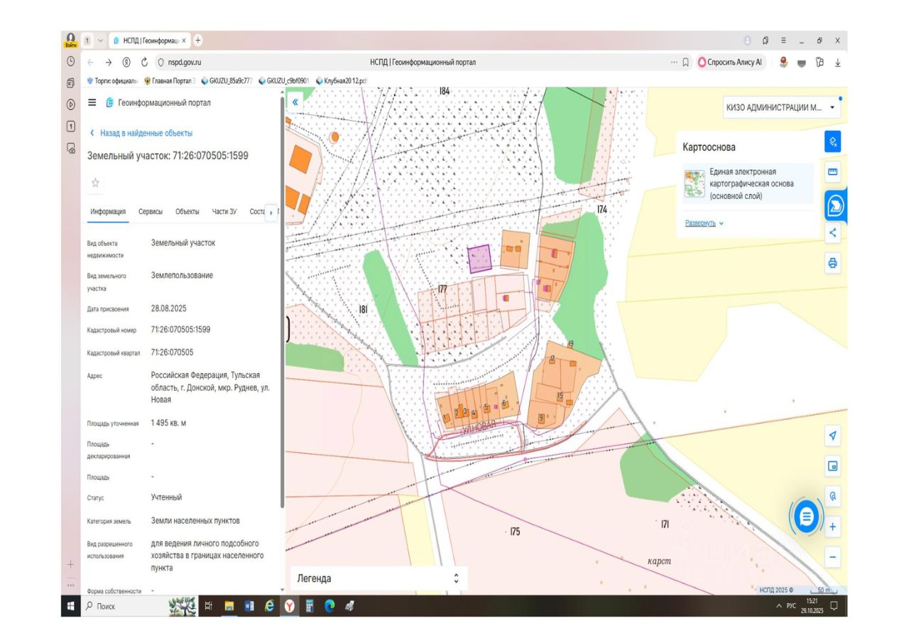 кадастровый номер 71:26:070505:1599; местоположение: Российская Федерация, Тульская область, г. Донской, мкр. Руднев, ул. Новая; площадь 1495,0 кв.м; разрешенное использование: для ведения личного подсобного хозяйства в границах населенного пункта
