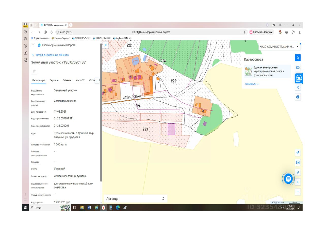 кадастровый номер 71:26:070201:381; местоположение: Тульская область, г. Донской, мкр. Задонье, ул. Трудовая; площадь 1500,0 кв.м; разрешенное использование: для ведения личного подсобного хозяйства