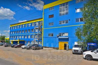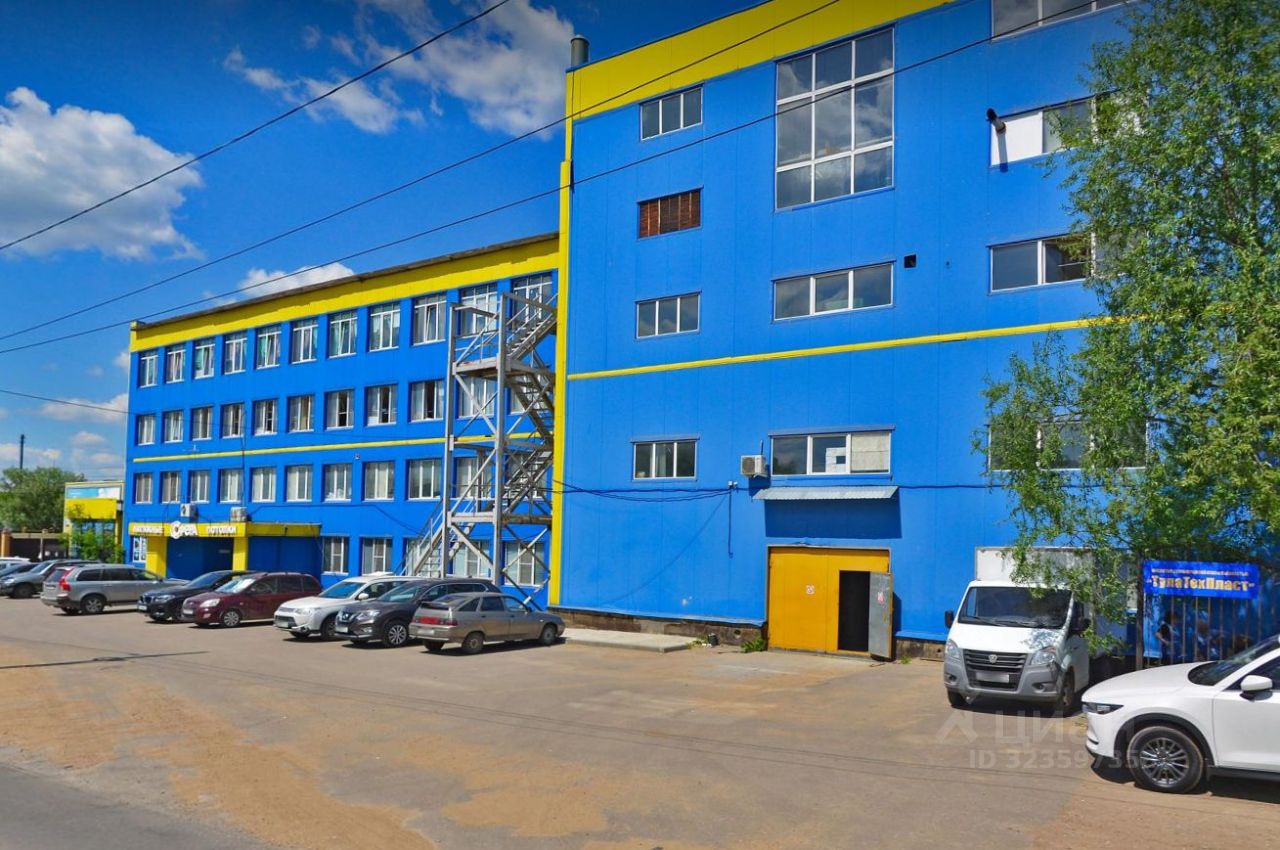 Грузовой лифт, большая парковка перед производственным зданием, общественный транспорт рядом.