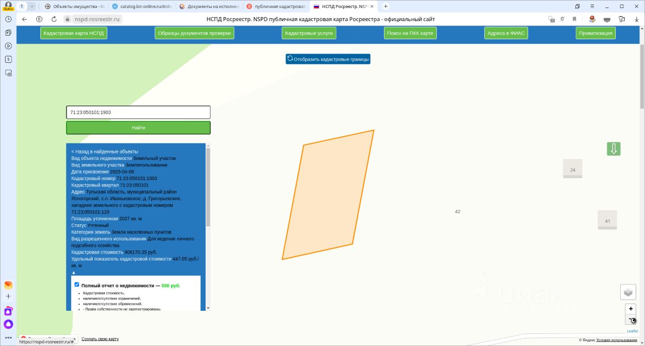 право заключения договора аренды земельного участка из земель населенных пунктов с кадастровым номером 71:23:050101:1903 площадью 2027 кв. м, адрес: Тульская область, муниципальный район Ясногорский, с.п. Иваньковское, д. Григорьевское, западнее земельного участка с кадастровым номером 71:23:050101:120, вид разрешенного использования: для ведения личного подсобного хозяйства.