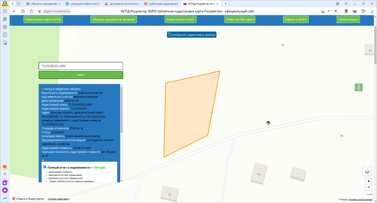 право заключения договора аренды земельного участка из земель населенных пунктов с кадастровым номером 71:23:050101:1902 площадью 2518 кв. м, адрес: Тульская область, муниципальный район Ясногорский, с.п. Иваньковское, д. Григорьевское, западнее земельного участка с кадастровым номером 71:23:050101:121, вид разрешенного использования: для ведения личного подсобного хозяйства.