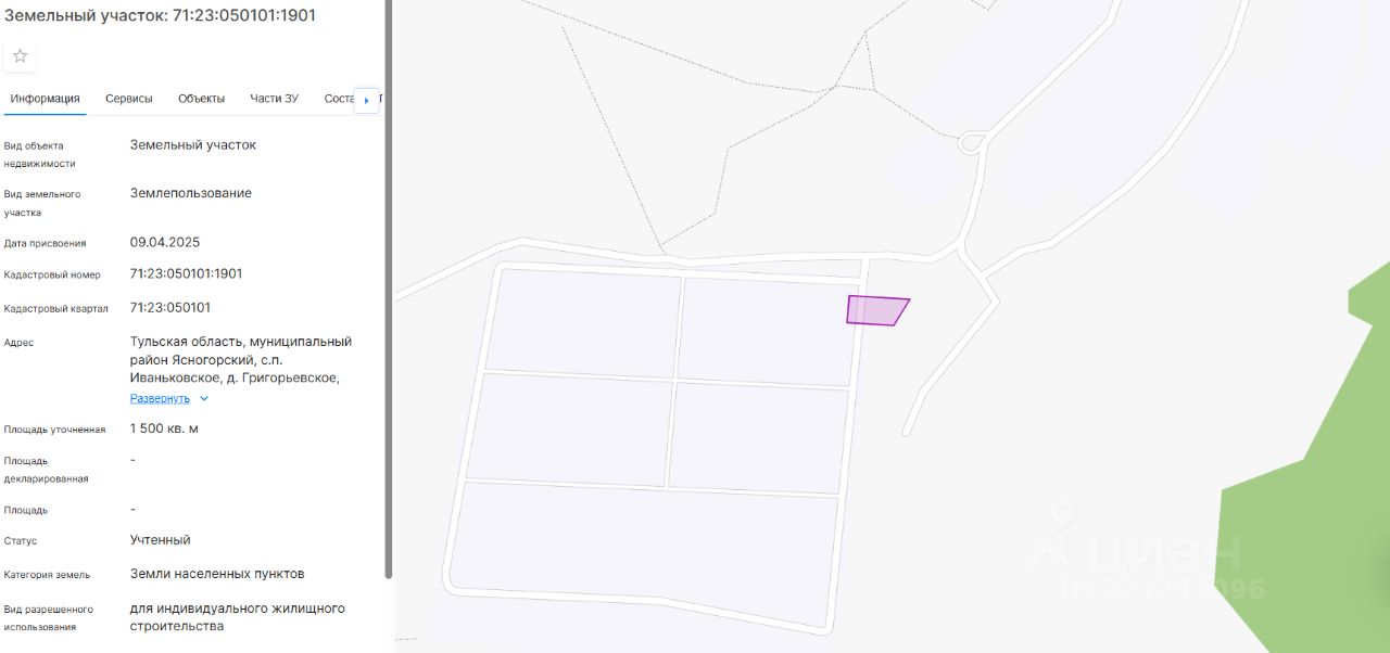 право заключения договора аренды земельного участка из земель населенных пунктов с кадастровым номером 71:23:050101:1901, площадь 1500 кв. м, местоположение: Тульская область, муниципальный район Ясногорский, с.п. Иваньковское, д. Григорьевское, южнее земельного участка с кадастровым номером 71:23:050101:232, вид разрешенного использования: для индивидуального жилищного строительства.