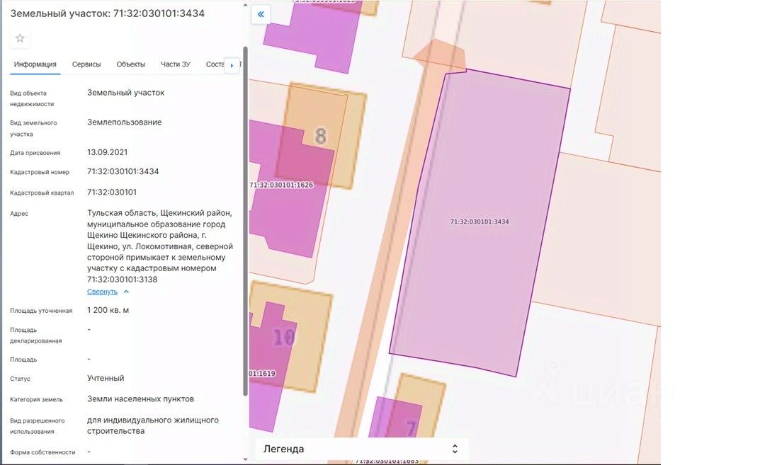 площадью 1200 кв.м, с кадастровым номером 71:32:030101:3434, категория земель "Земли населенных пунктов", местоположение земельного участка: Тульская область, Щекинский район, муниципальное образование город Щекино Щекинского района, г. Щекино, ул. Локомотивная, северной стороной примыкает к земельному участку с кадастровым номером 71:32:030101:3138, разрешенное использование для индивидуального жилищного строительства