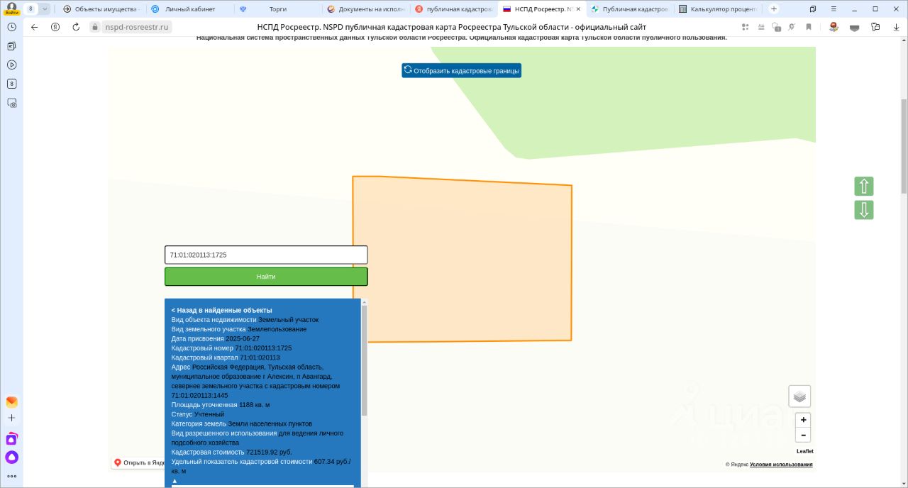 право заключения договора аренды земельного участка из земель населенных пунктов с кадастровым номером 71:01:020113:1725 площадью 1188 кв. м, адрес: Российская Федерация, Тульская область, муниципальное образование г. Алексин, п. Авангард, севернее земельного участка с кадастровым номером 71:01:020113:1445, вид разрешенного использования: для ведения личного подсобного хозяйства.