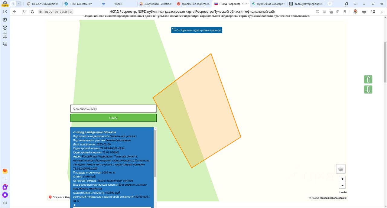 право заключения договора аренды земельного участка из земель населенных пунктов с кадастровым номером 71:01:010401:4234 площадью 1000 кв. м, адрес: Российская Федерация, Тульская область, муниципальное образование г. Алексин, д. Хатманово, западнее земельного участка с кадастровым номером 71:01:010401:1026, вид разрешенного использования: для ведения личного подсобного хозяйства.