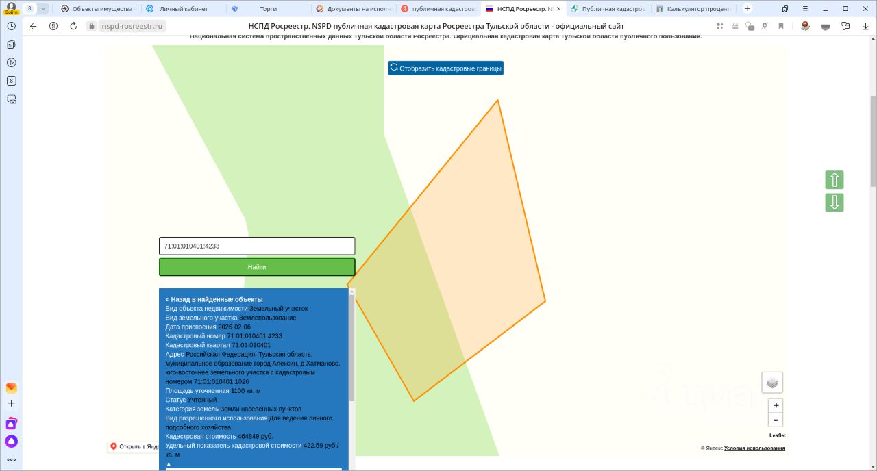 право заключения договора аренды земельного участка из земель населенных пунктов с кадастровым номером 71:01:010401:4233 площадью 1100 кв. м, адрес: Российская Федерация, Тульская область, муниципальное образование г. Алексин, д. Хатманово, юго-восточнее земельного участка с кадастровым номером 71:01:010401:1026, вид разрешенного использования: для ведения личного подсобного хозяйства.