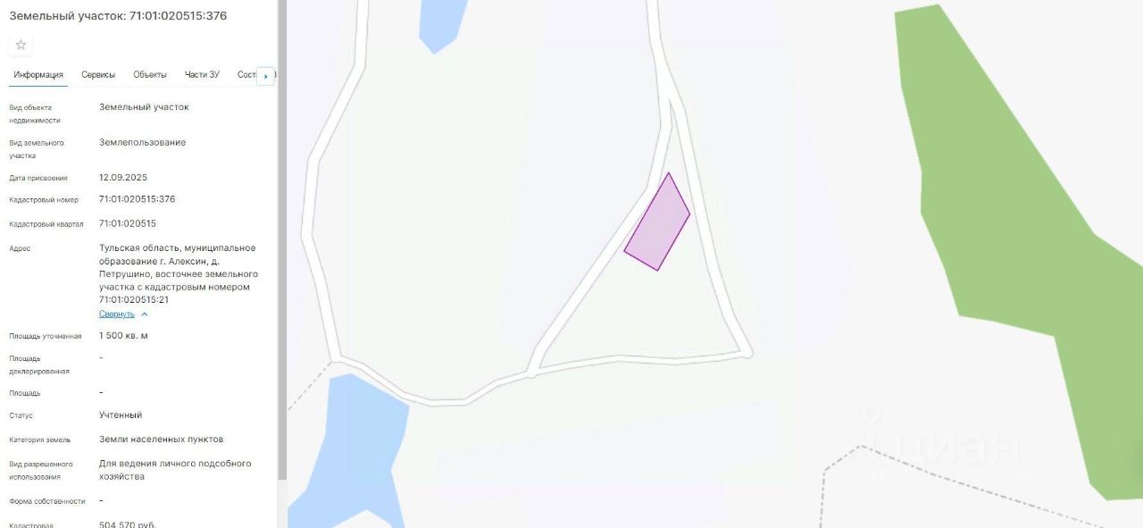 право заключения договора аренды земельного участка из земель населенных пунктов с кадастровым номером 71:01:020515:376 площадью 1500 кв. м, адрес: Тульская область, МО г. Алексин, д. Петрушино, восточнее земельного участка с кадастровым номером 71:01:020515:21, вид разрешенного использования: для ведения личного подсобного хозяйства.