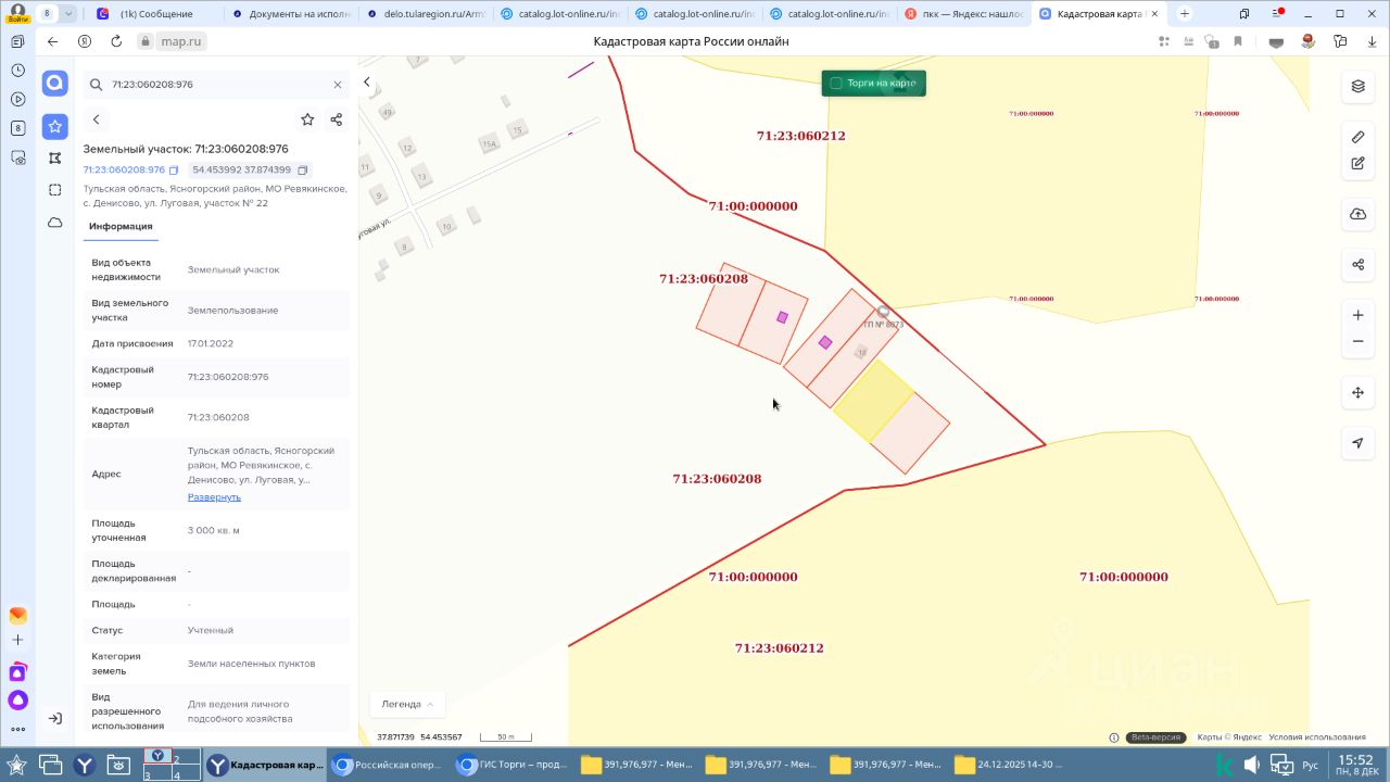право заключения договора аренды земельного участка из земель населенных пунктов с кадастровым номером 71:23:060208:976, площадь 3000 кв. м, местоположение: Российская Федерация, Тульская область, Ясногорский район, МО Ревякинское, с. Денисово, ул. Луговая, участок 22 , вид разрешенного использования: для ведения личного подсобного хозяйства.