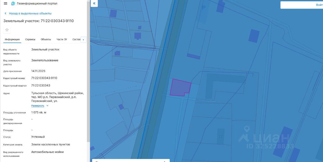 Земельный участок площадью 1075 кв. м с кадастровым номером 71:22:030343:9110, категория земель "Земли населенных пунктов", адрес земельного участка: Тульская область, Щекинский район, МО р.п. Первомайский, р.п. Первомайский, ул. Административная, южнее земельного участка с кадастровым номером 71:22:030343:114, с разрешенным использованием "Автомобильные мойки"