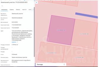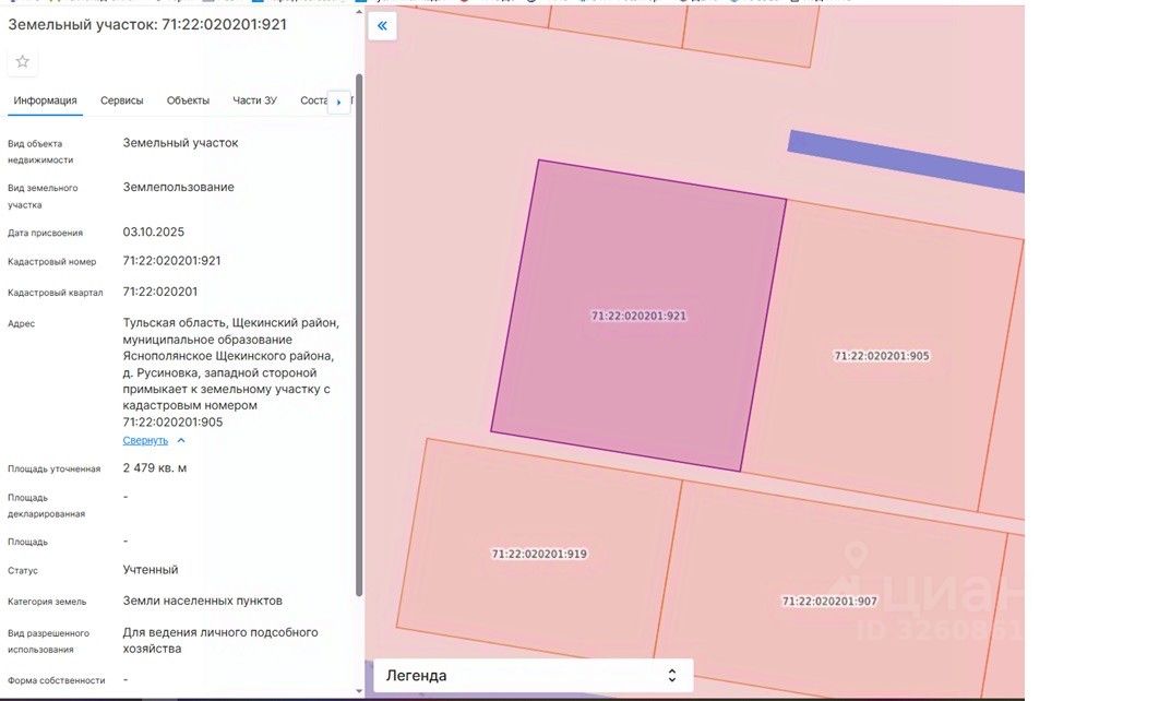площадью 2479 кв.м, с кадастровым номером 71:22:020201:921, категория земель "Земли населенных пунктов", местоположение земельного участка: Тульская область, Щекинский район, муниципальное образование Яснополянское Щекинского района, д. Русиновка, западной стороной примыкает к земельному участку с кадастровым номером 71:22:020201:905, разрешенное использование для ведения личного подсобного хозяйства