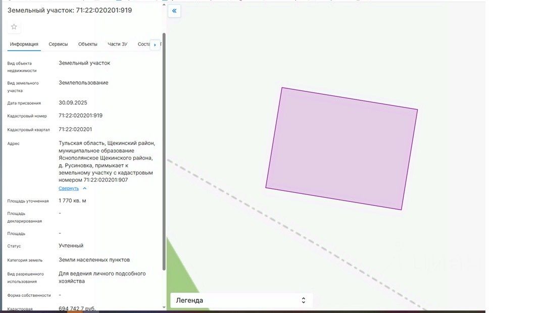 площадью 1770 кв.м, с кадастровым номером 71:22:020201:919, категория земель "Земли населенных пунктов", местоположение земельного участка: Тульская область, Щекинский район, муниципальное образование Яснополянское Щекинского района, д. Русиновка, примыкает к земельному участку с кадастровым номером 71:22:020201:907, разрешенное использование для ведения личного подсобного хозяйства