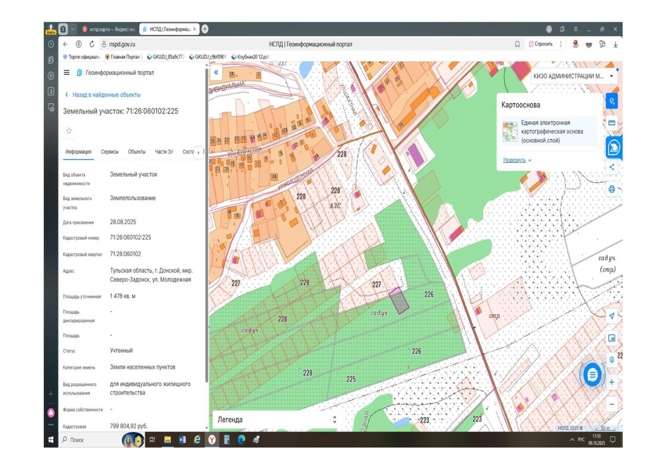 Земельный участок с кадастровым номером 71:26:060102:225 площадь 1478 по адресу Тульская область, г. Донской, мкр. Северо-Задонск, ул. Молодежная