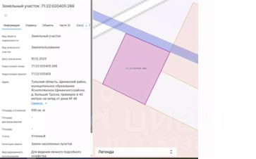 площадью 595 кв.м, с кадастровым номером 71:22:020405:266, категория земель "Земли населенных пунктов", местоположение земельного участка: Тульская область, Щекинский район, муниципальное образование Яснополянское Щекинского района, д. Большая Тросна, примерно в 40 метрах на запад от дома 46, разрешенное использование для ведения личного подсобного хозяйства
