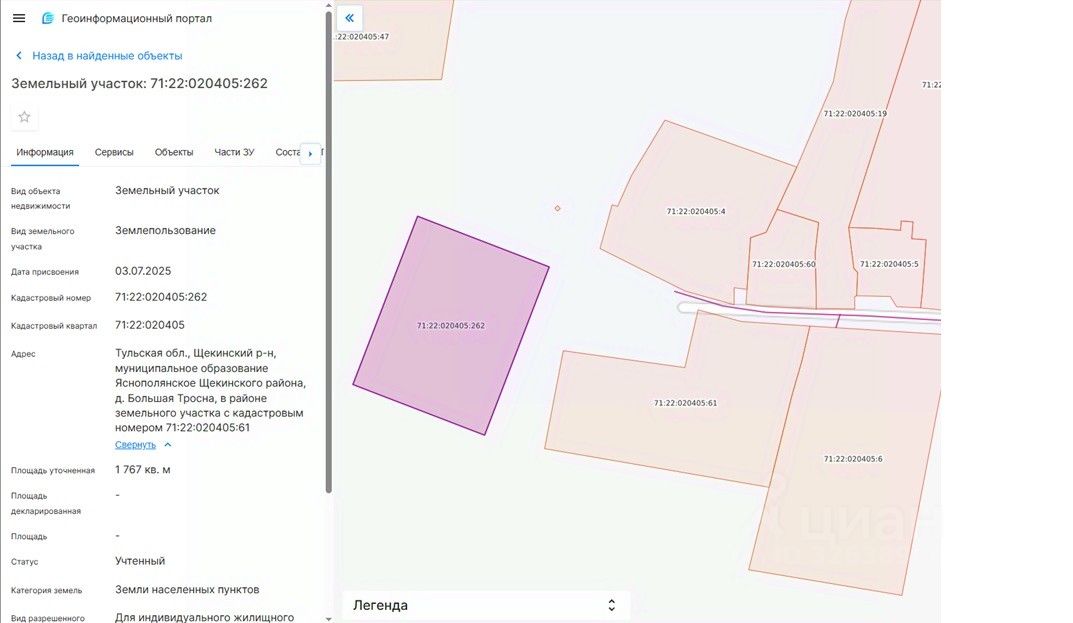 площадью 1767 кв.м, с кадастровым номером 71:22:020405:262, категория земель "Земли населенных пунктов", местоположение земельного участка: Тульская область, Щекинский район, муниципальное образование Яснополянское Щекинского района, д. Большая Тросна, в районе земельного участка с кадастровым номером 71:22:020405:61, с разрешенным использованием для индивидуального жилищного строительства