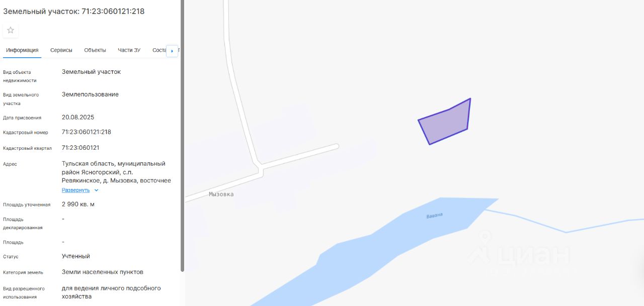 право заключения договора аренды земельного участка из земель населенных пунктов с кадастровым номером 71:23:060121:218, площадь 2990 кв. м, местоположение: Тульская область, муниципальный район Ясногорский, с.п. Ревякинское, д. Мызовка, восточнее земельного участка с кадастровым номером 71:23:060121:10, вид разрешенного использования: для ведения личного подсобного хозяйства