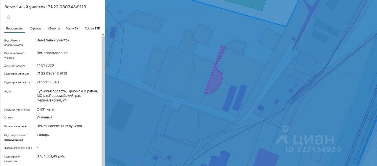 Земельный участок площадью 2431 кв. м с кадастровым номером 71:22:030343:9113, категория земель "Земли населенных пунктов", адрес (местоположение) земельного участка: Тульская область, Щекинский район, МО р.п. Первомайский, р.п. Первомайский, ул. Административная, с разрешенным использованием "Склады"