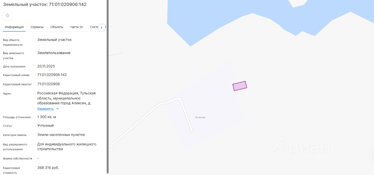 право заключения договора аренды земельного участка из земель населенных пунктов с кадастровым номером 71:01:020906:142, площадь 1300 кв. м, местоположение: Тульская область, муниципальное образование город Алексин, д. Есипово, южнее земельного участка с кадастровым номером 71:01:020906:6, виды разрешенного использования: для индивидуального жилищного строительства