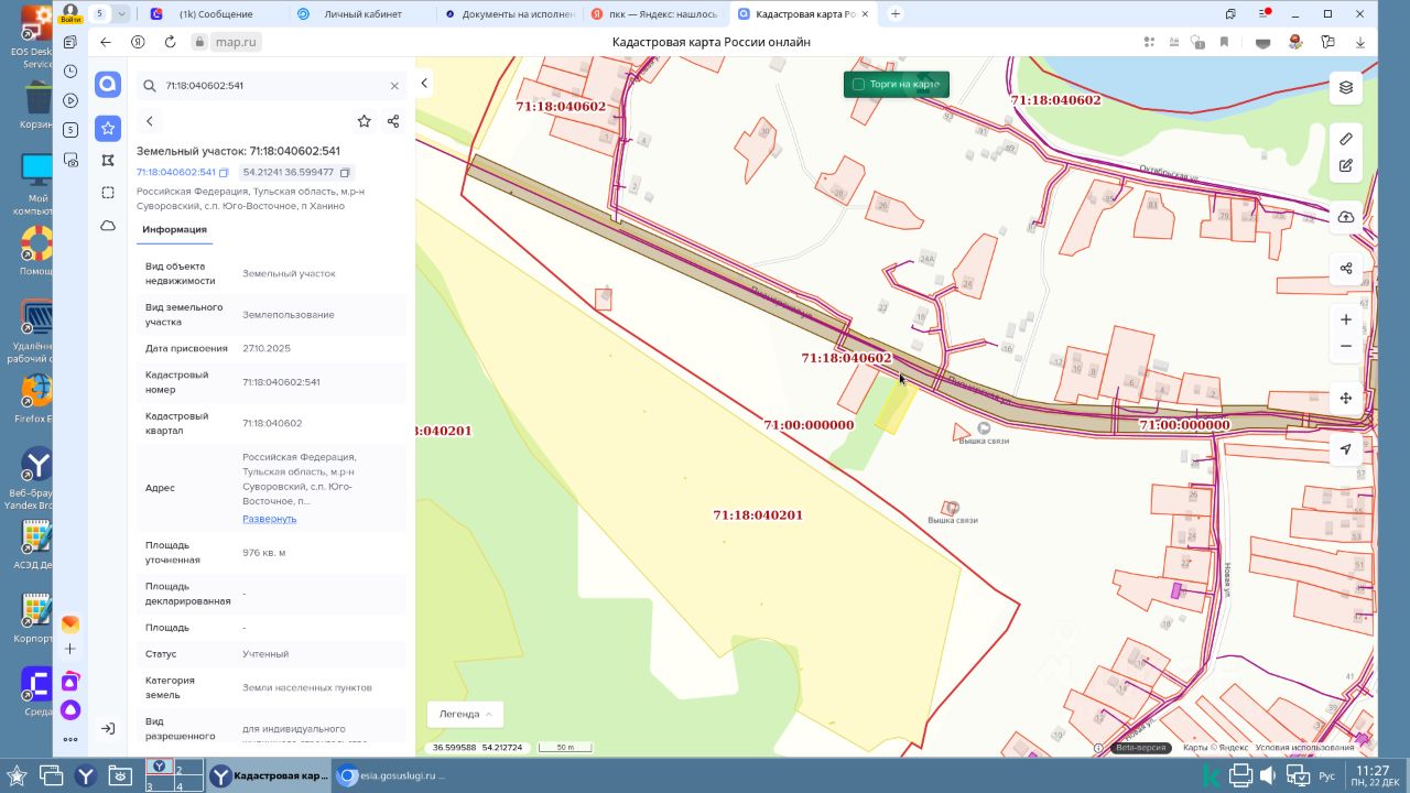 право заключения договора аренды земельного участка из земель населенных пунктов с кадастровым номером 71:18:040602:541, площадь 976 кв. м, местоположение: Тульская область, Суворовский район, п. Ханино, вид разрешенного использования: для индивидуального жилищного строительства.