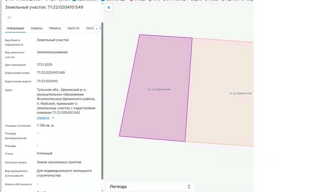 площадью 1136 кв.м, с кадастровым номером 71:22:020410:549, категория земель "Земли населенных пунктов", местоположение земельного участка: Тульская область, Щекинский район, муниципальное образование Яснополянское Щекинского района, п. Майский, примыкает к земельному участку с кадастровым номером 71:22:020410:542, разрешенное использование для индивидуального жилищного строительства