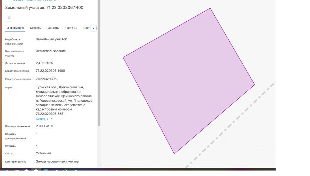 площадью 2000 кв.м, с кадастровым номером 71:22:020306:1400, категория земель "Земли населенных пунктов", местоположение земельного участка: Тульская область, Щекинский район, муниципальное образование Яснополянское Щекинского района, п. Головеньковский, ул. Пчеловодов, западнее земельного участка с кадастровым номером 71:22:020306:558, с разрешенным использованием для индивидуального жилищного строительства