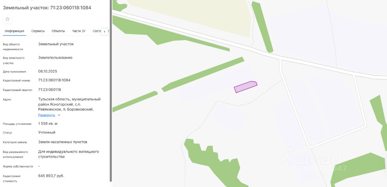 право заключения договора аренды земельного участка из земель населенных пунктов с кадастровым номером 71:23:060118:1084, площадь 1 559 кв. м, местоположение: Тульская область, муниципальный район Ясногорский, сельское поселение Ревякинское, поселок Боровковский, южнее земельного участка с кадастровым номером 71:23:060118:151, виды разрешенного использования: для индивидуального жилищного строительства