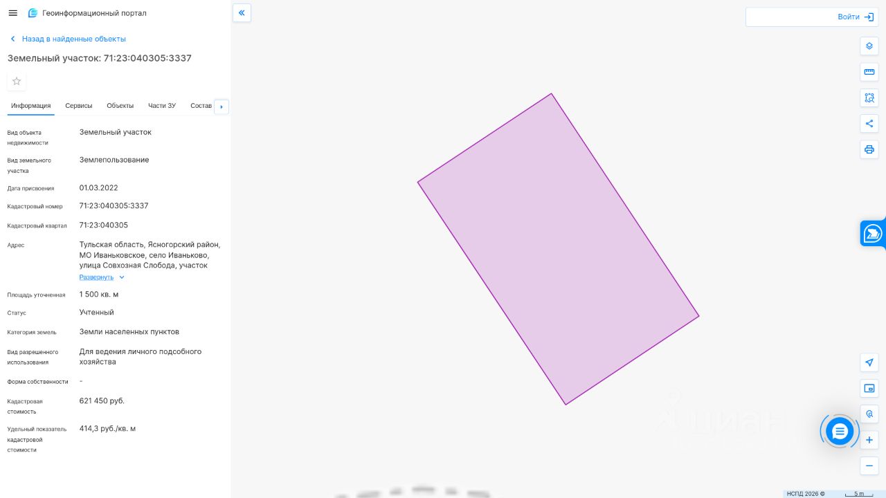 Право заключения договора аренды земельного участка из земель населенных пунктов с кадастровым номером 71:23:040305:3337 площадью 1500 кв. м, местоположение: Тульская область, Ясногорский район, МО Иваньковское, село Иваньково, улица Совхозная Слобода, участок 59А, вид разрешенного использования: для ведения личного подсобного хозяйства.