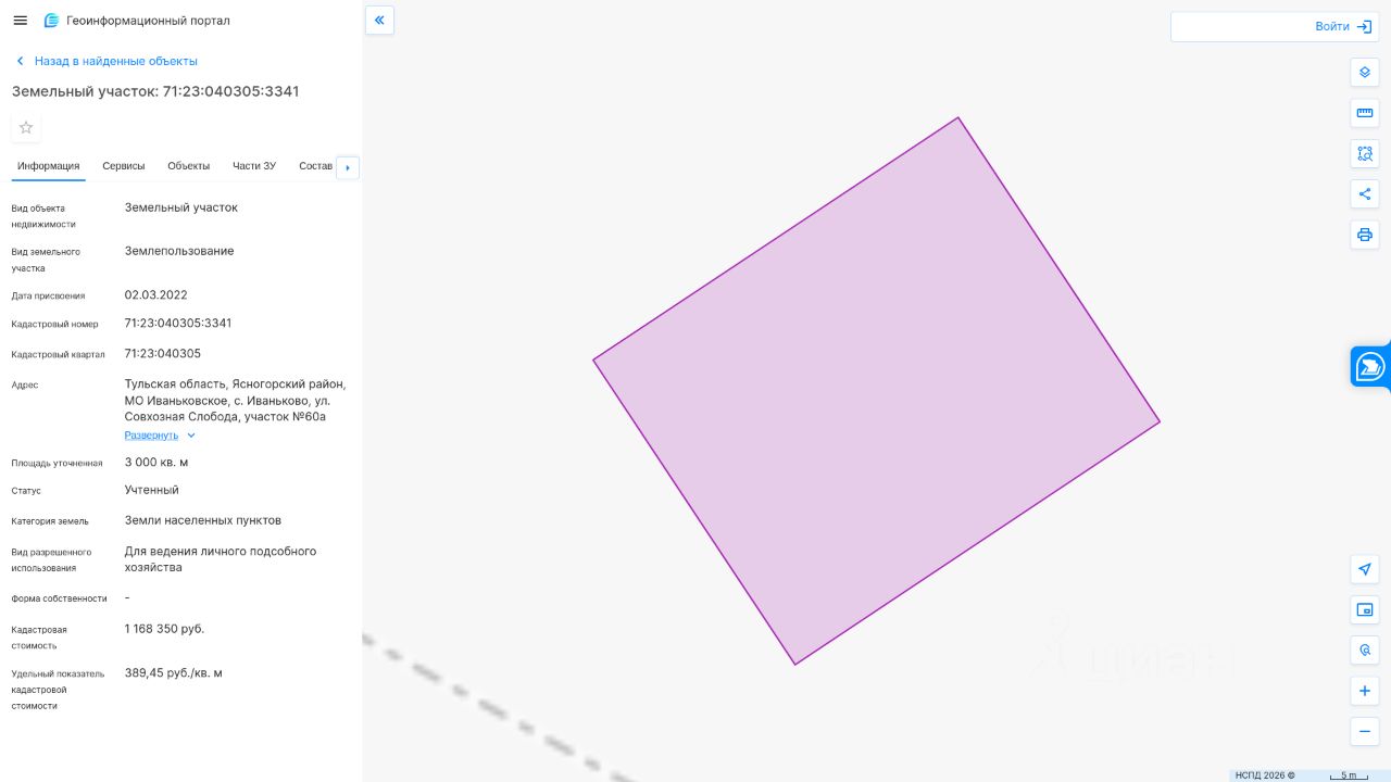 Право заключения договора аренды земельного участка из земель населенных пунктов с кадастровым номером 71:23:040305:3341 площадью 3000 кв. м, местоположение: Тульская область, Ясногорский район, МО Иваньковское, с. Иваньково, ул. Совхозная Слобода, участок 60а, вид разрешенного использования: для ведения личного подсобного хозяйства.