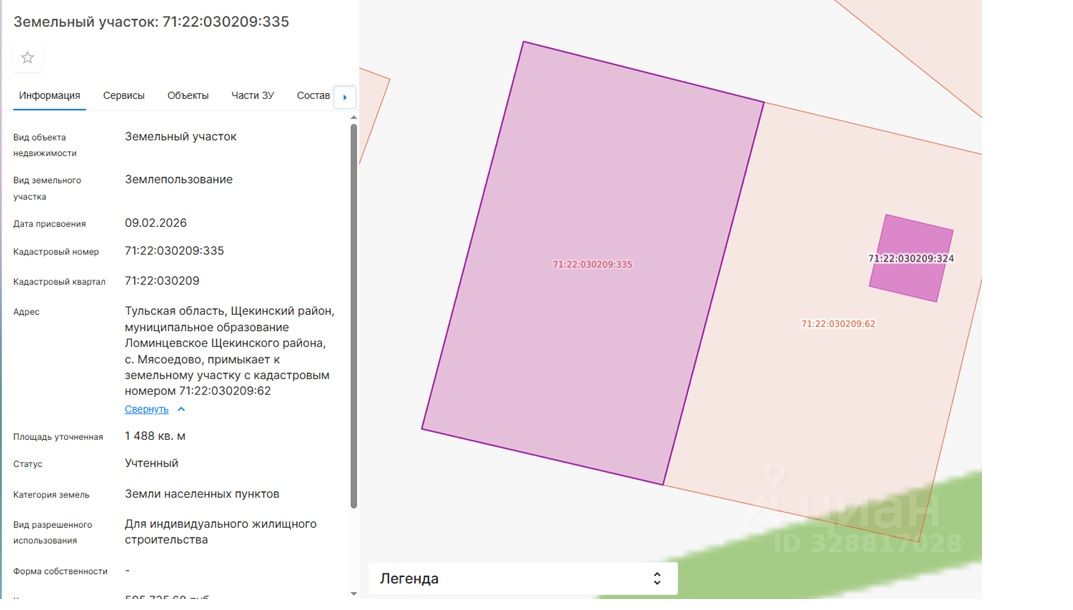 площадью 1488 кв.м, с кадастровым номером 71:22:030209:335, категория земель "Земли населенных пунктов", местоположение земельного участка: Тульская область, Щекинский район, муниципальное образование Ломинцевское Щекинского района, с. Мясоедово, примыкает к земельному участку с кадастровым номером 71:22:030209:62, с разрешенным использованием для индивидуального жилищного строительства