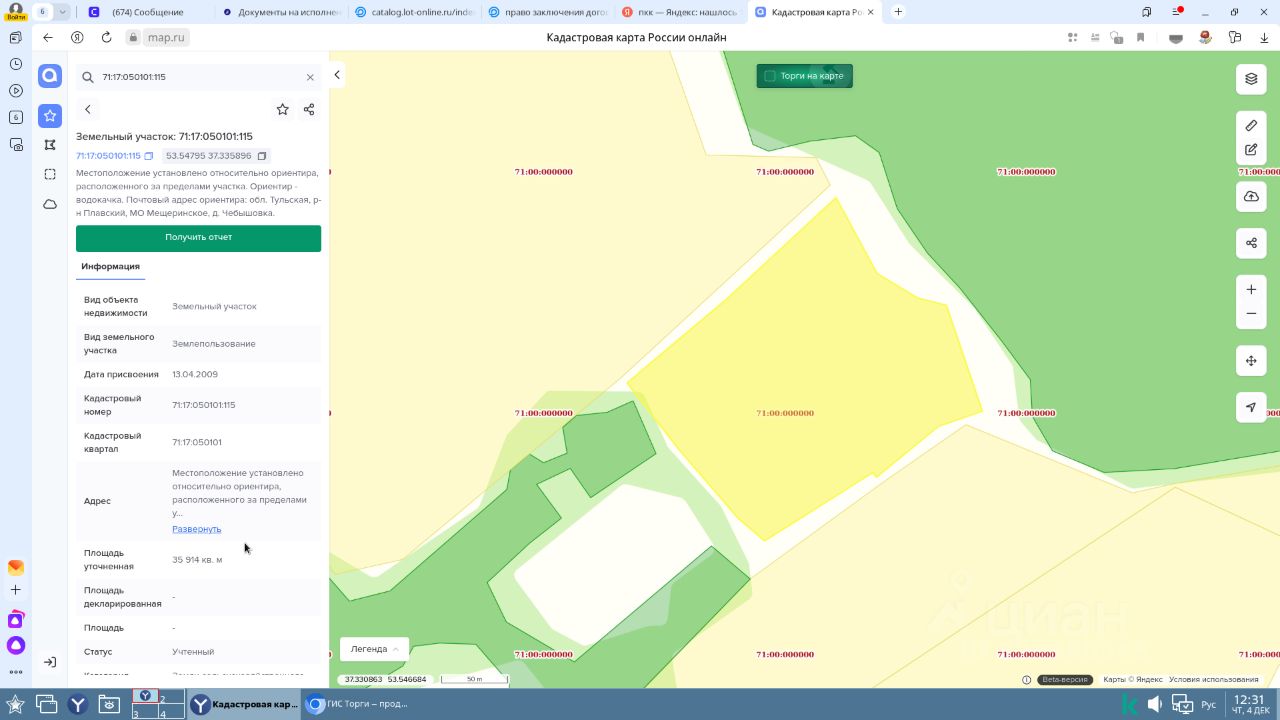 право заключения договора аренды земельного участка, находящегося в собственности Тульской области, из земель сельскохозяйственного назначения, с кадастровым номером 71:17:050101:115, площадью 35914 кв. м, местоположение: местоположение установлено относительно ориентира, расположенного за пределами участка. Ориентир — водокачка. Участок находится примерно в 1870 м по направлению на северо — восток от ориентира. Почтовый адрес ориентира: обл. Тульская, р-н Плавский, МО Мещерское, д. Чебышовка, вид разрешенного использования: сельскохозяйственное производства.