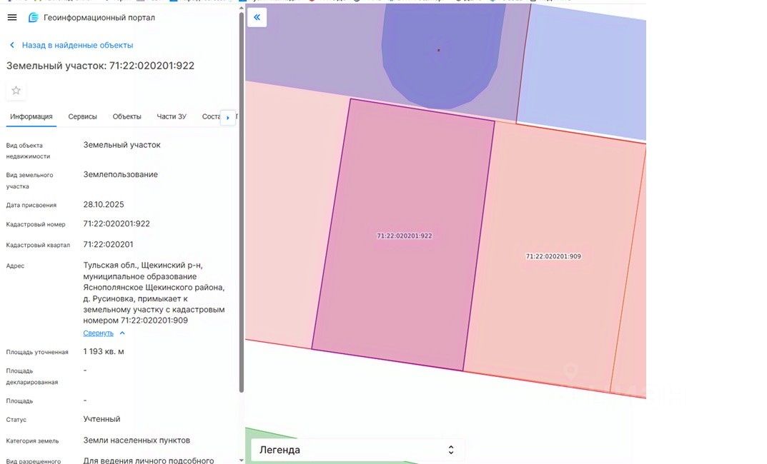 площадью 1193 кв.м, с кадастровым номером 71:22:020201:922, категория земель "Земли населенных пунктов", местоположение земельного участка: Тульская область, Щекинский район, муниципальное образование Яснополянское Щекинского района, д. Русиновка, примыкает к земельному участку с кадастровым номером 71:22:020201:909, разрешенное использование для ведения личного подсобного хозяйства