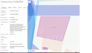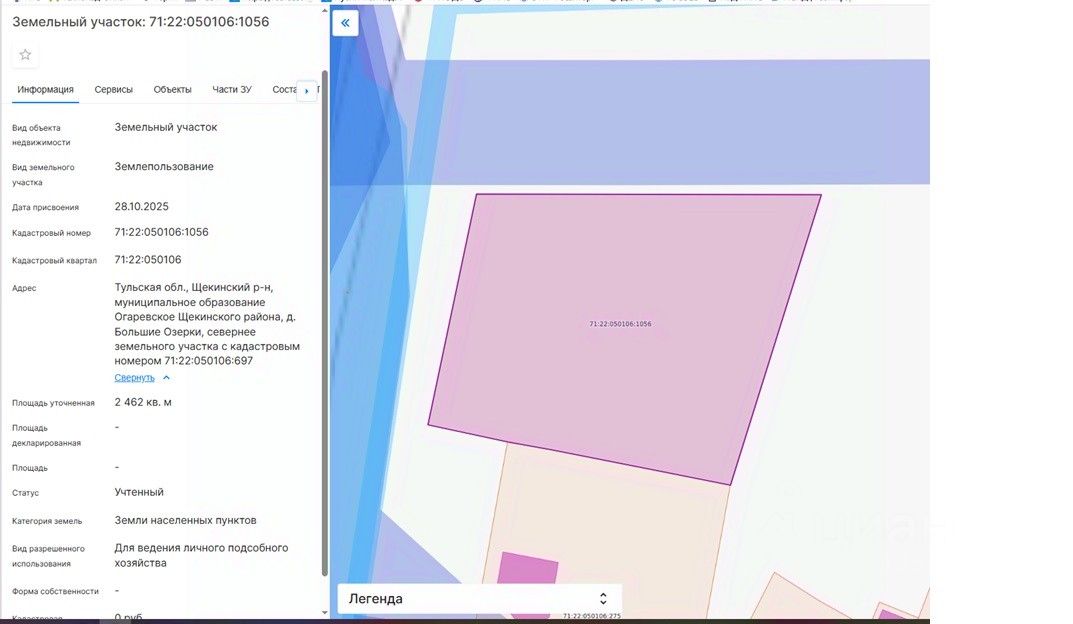 площадью 2462 кв.м, с кадастровым номером 71:22:050106:1056, категория земель "Земли населенных пунктов", местоположение земельного участка: Тульская область, Щекинский район, муниципальное образование Огаревское Щекинского района, д. Большие Озерки, севернее земельного участка с кадастровым номером 71:22:050106:697, разрешенное использование для ведения личного подсобного хозяйства