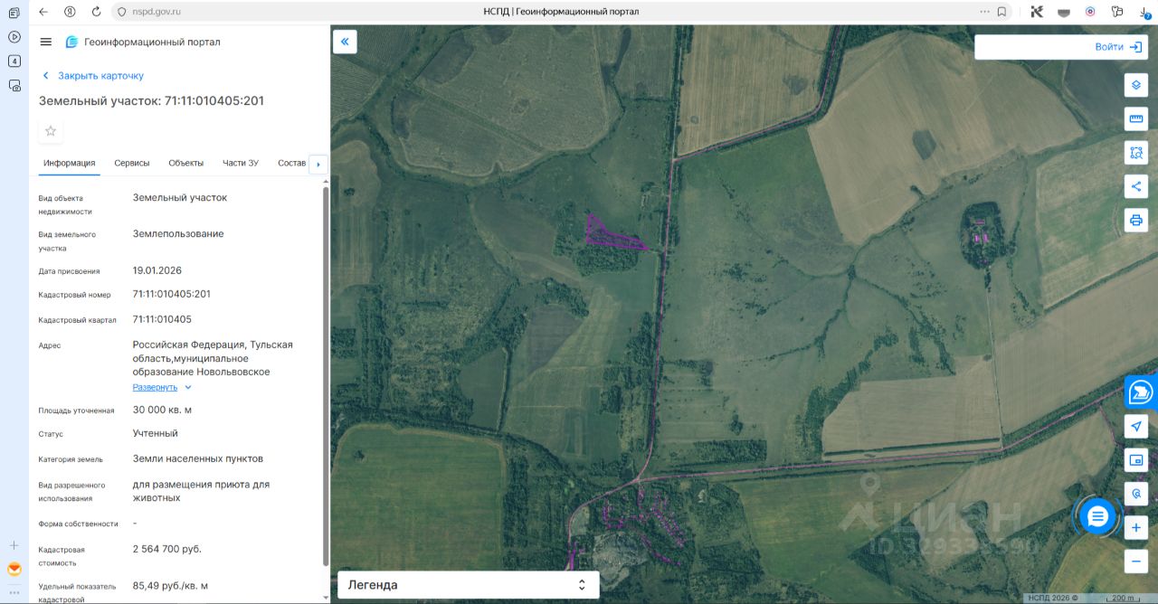 Земельный участок с кадастровым номером 71:11:010405:201 площадь 30000 по адресу Российская Федерация, Тульская область,муниципальное образование Новольвовское Кимовского района, отд. Румянцево