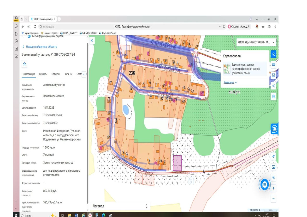 Земельный участок с кадастровым номером 71:26:070902:494 площадь 1500 по адресу Российская Федерация, Тульская область, г.о. город Донской, мкр Подлесный, ул Железнодорожная