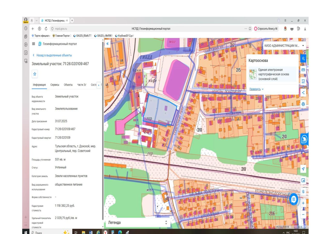 Земельный участок с кадастровым номером 71:26:020109:467 площадь 551 по адресу Тульская область, г. Донской, мкр. Центральный, пер. Советский