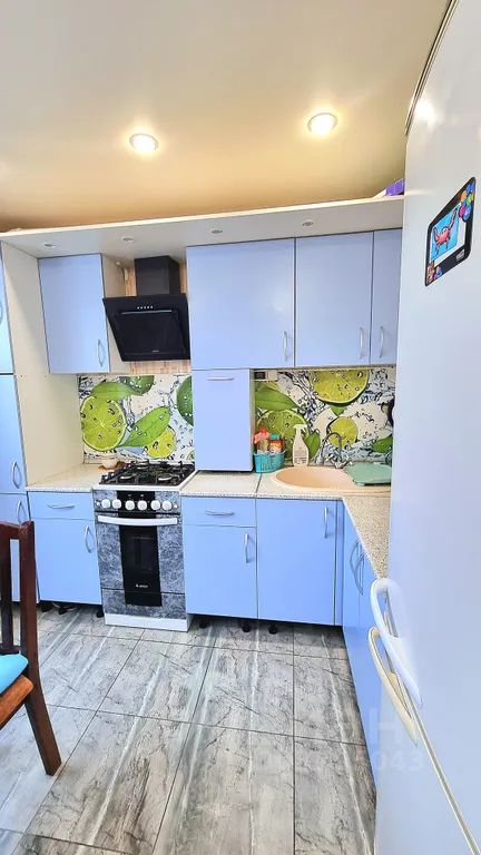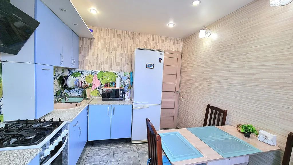 Кухня со всей необходимой посудой и техникой: холодильник, микроволновка, чайник, духовка