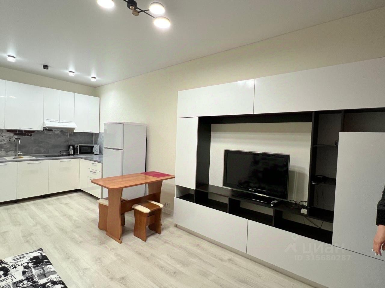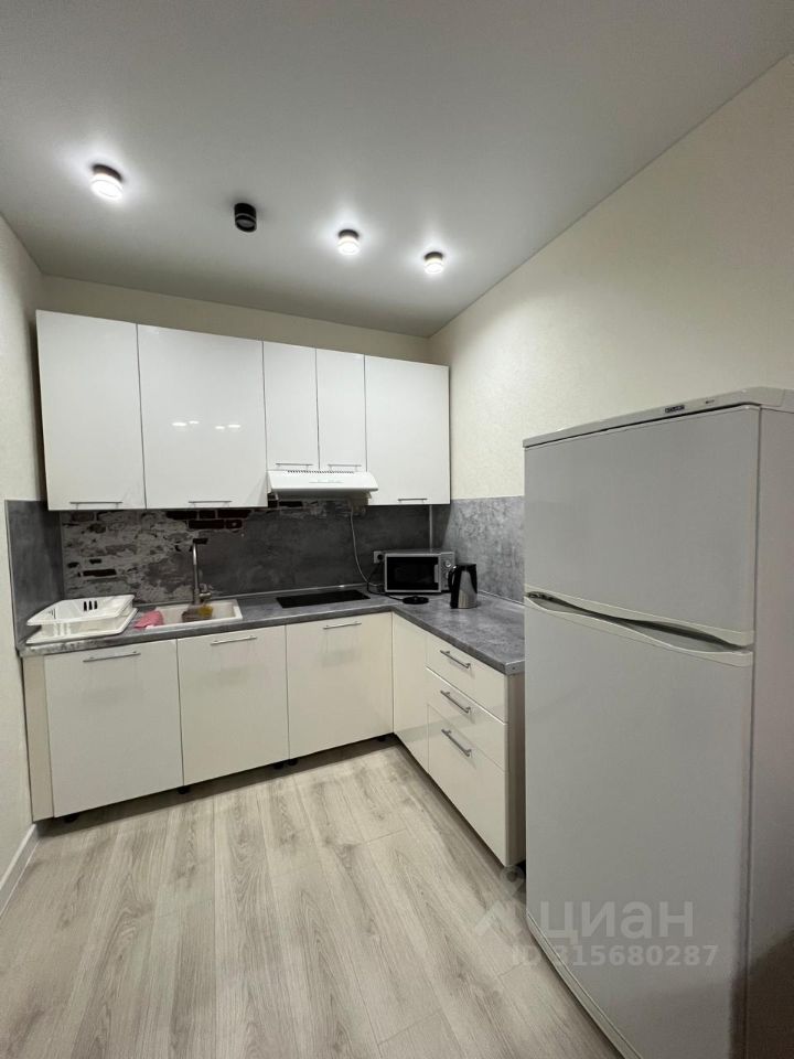 На кухне установлена современная мебель и бытовая техника, в комнате мебели нет