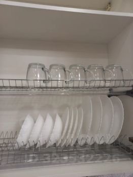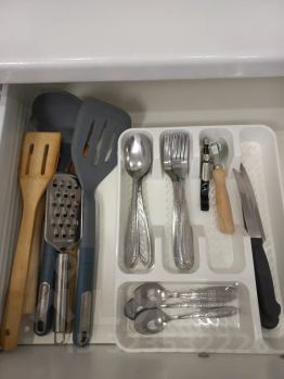 Кухня с полноценной плитой и духовкой, холодильником, микроволновкой, набором посуды и приборов для 4-х человек. Есть все необходимое для проживания.