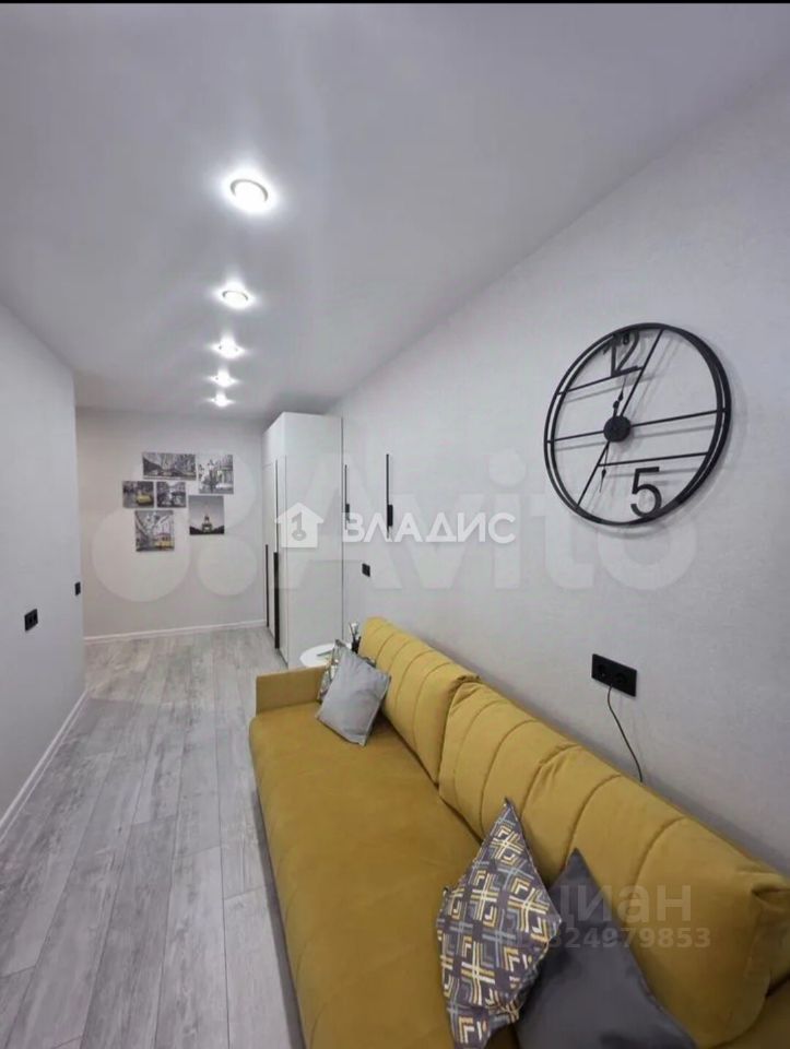 - Просторная гостиная с ярким акцентом: стильный жёлтый диван, большие настенные часы, уютное освещение
