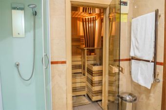 Санузел оснащен туалетом, раковиной, ванной, финской сауной, феном и всеми необходимыми туалетными принадлежностями.