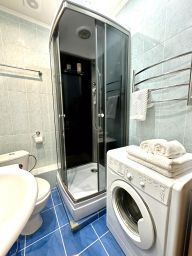 В квартире есть все для комфортного проживания двух персон.В спальне-гостиной: двуспальная кровать 160х200см с качественным матрасом, идеальное постельное белье отельного качества из хлопка 100%, подушки повышенной комфортности, которые дарят сладкий сон на всю ночь, большое евро одеяло, большой СМАРТ ТВ, который с легкостью превратит студию в кинотеатр, шкаф, высокоскоростной Wi-Fi. На кухне: кухонный гарнитур, электрическая плита, холодильник, микроволновая печь, электрический чайник, посуда для сервировки и приготовления блюд, чай/кофе. В ванной: душевая кабина, зеркало, шампунь/гель для душа, белоснежные полотенца, стиральная машина, фен.