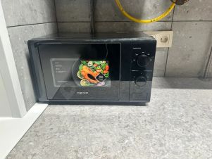 Полностью оборудованная кухня: холодильник, плита, микроволновка, чайник, посуда