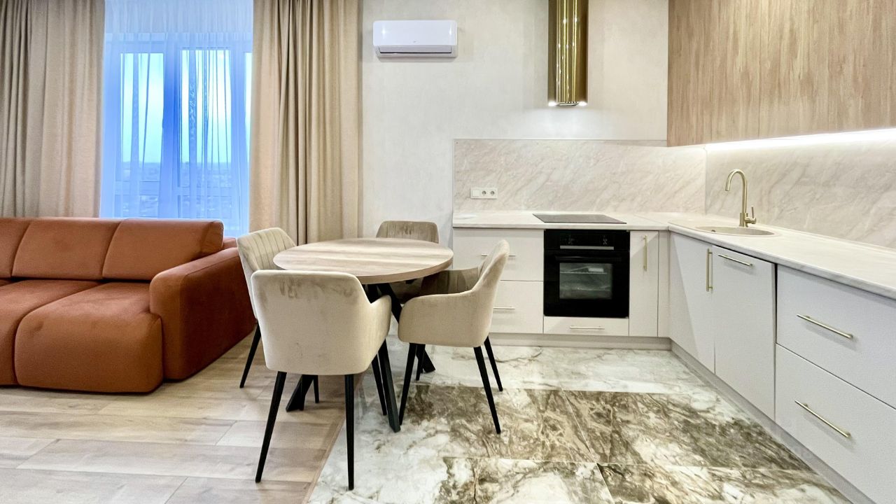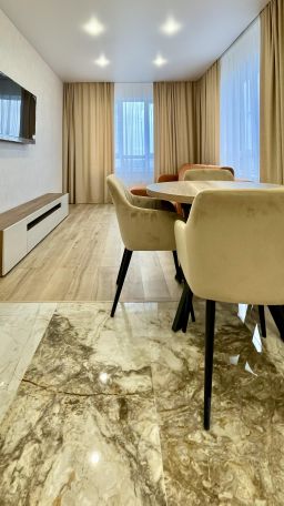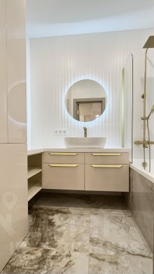 В квартире есть всё необходимое для комфортного проживания. Стильная мебель на кухне и в комнате делает интерьер уютным и современным. Из техники можно найти кондиционер, холодильник, посудомоечную и стиральную машины, а также телевизор. Просторная ванная комната оборудована ванной.