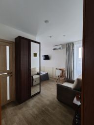 Номер отличается улучшенной планировкой просторные апартаменты, есть балкон и туалетная комната с душем. Жилая часть номера делится на обеденную зону и зону для отдыха и сна.