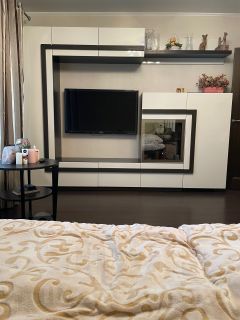 • В гостиной раскладной угловой диван, рабочая зона с компьютерным креслом и точкой доступа к интернету через кабель, кондиционер, большой телевизор, удобные и вместительные шкафы.