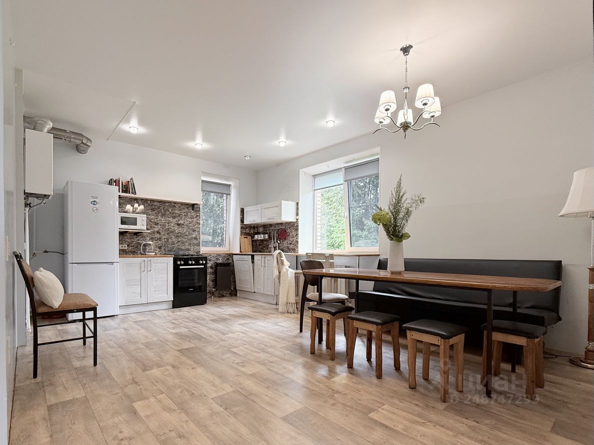 просторная гостиная вмещает: кухню, обеденную зону на 9 человек и зону утреннего кофе у окна