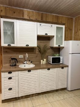 -гостиная - раскладной диван (спальное место для 2-х взрослых ), большой телевизор, большой обеденный стол , кухонный гарнитур , холодильник , эл.плита, набор всей необходимой посуды.