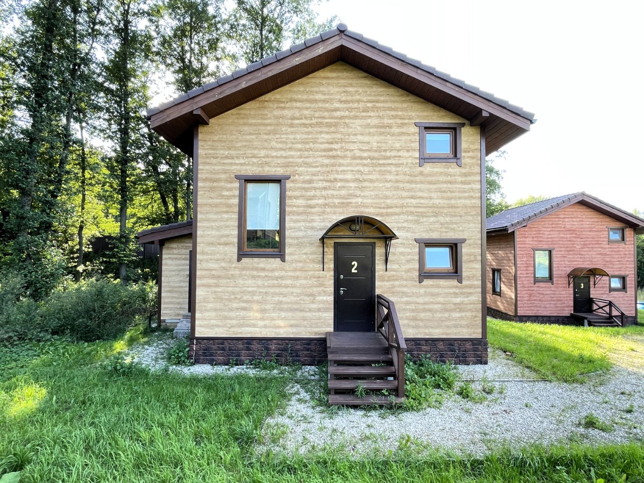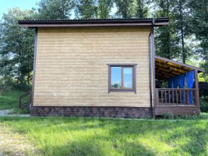 Дом двухэтажный, с террасой и мангальной зоной. Внутри гостиная с кухней, две спальни и два санузла. Теплые полы на первом этаже.