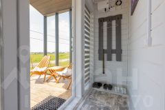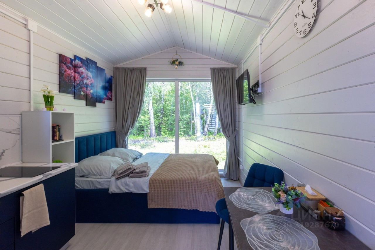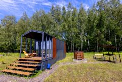 Уютные дома с панорамными окнами в лес, на верандах шезлонги для отдыха