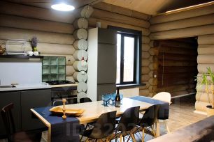 На первом этаже располагается кухня, переходящая в обеденную зону с большим столом .